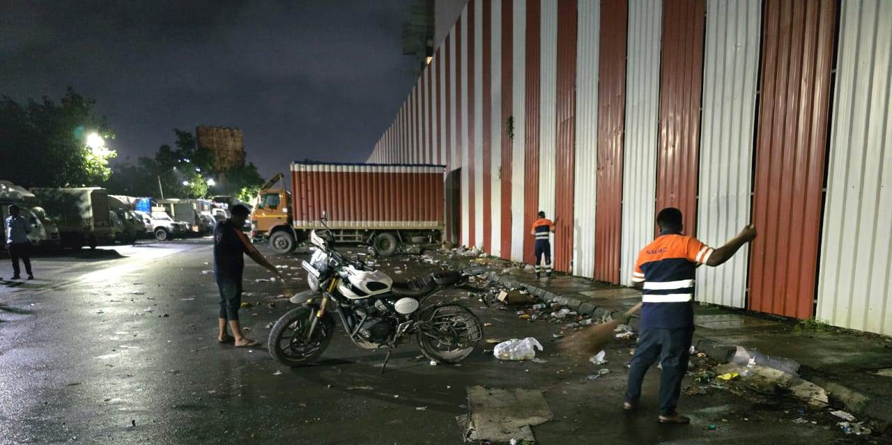 नवी मुंबई : मुंबईमध्ये सुरु असलेल्या मराठा आंदोलनाच्या पार्श्वभूमीवर आंदोलक मोठया संख्येने नवी मुंबईमध्ये सिडको एक्झिबिशन सेंटर व इतर ठिकाणी थांबलेले होते. ०२ सप्टेंबर रोजी आंदोलनाची सांगता झाल्यानंतर हे नागरिक आपापल्या गावांकडे परतले. राज्याच्या इतर भागांतून एकाच वेळी इतक्या मोठया संख्येने नागरिक नवी मुंबईमध्ये आल्याने शहर स्वच्छतेकडे विशेष लक्ष देण्याचे निर्देश आयुक्त डॉ. कैलास शिंदे यांनी दिले होते. त्या अनुषंगाने दैनंदिन स्वच्छता कार्यात या भागात विशेष स्वच्छता पथके तैनात करण्यात आली होती.