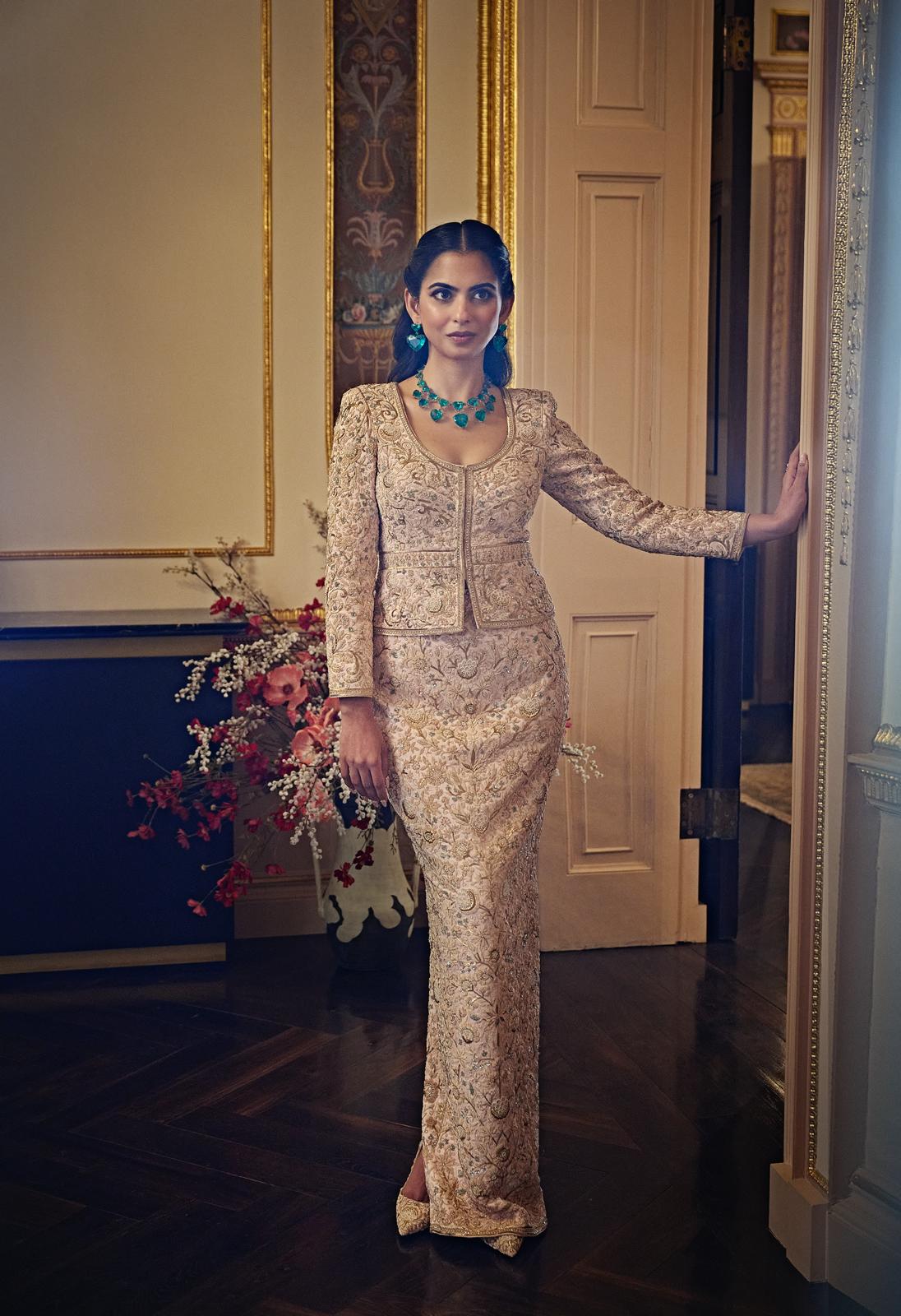 ईशा अबू जानी संदीप खोसला यांच्या कस्टम पोशाखात तेजस्वी होती, ज्यांना दीर्घकाळापासून लक्झरी भारतीय डिझाइनचा आधारस्तंभ मानले जाते, जुन्या जगाच्या प्रणय आणि आधुनिक परिष्काराचे प्रतीक आहे. ब्लश गुलाबी चामोईज सॅटिन जॅकेट आणि कॉलम स्कर्ट हे जुन्या गुलाबी जरदोझीमध्ये मोती, सिक्विन्स आणि क्रिस्टल्ससह, ताज्या, चमकदार पॅलेटमध्ये क्लिष्टपणे हाताने भरतकाम केलेले होते. ३५ हून अधिक कारागिरांनी ३,६७० तास घालवले आणि कॉउचर व्हिजन जिवंत केले. गुलाबी बॉल थीमचा सन्मान करण्यासाठी एक विशेष तंत्र, डिझायनर्सनी प्रथमच गुलाबी जरदोझीसह काम केले, जे अन्यथा सोन्याचे असते. परिणाम म्हणजे एक अनपेक्षित पुनर्व्याख्यान, कला आणि परंपरेचे एक ओड, तरीही आधुनिक, आत्मविश्वासू आणि सहजतेने थंड वाटणाऱ्या पद्धतीने सादर केले.