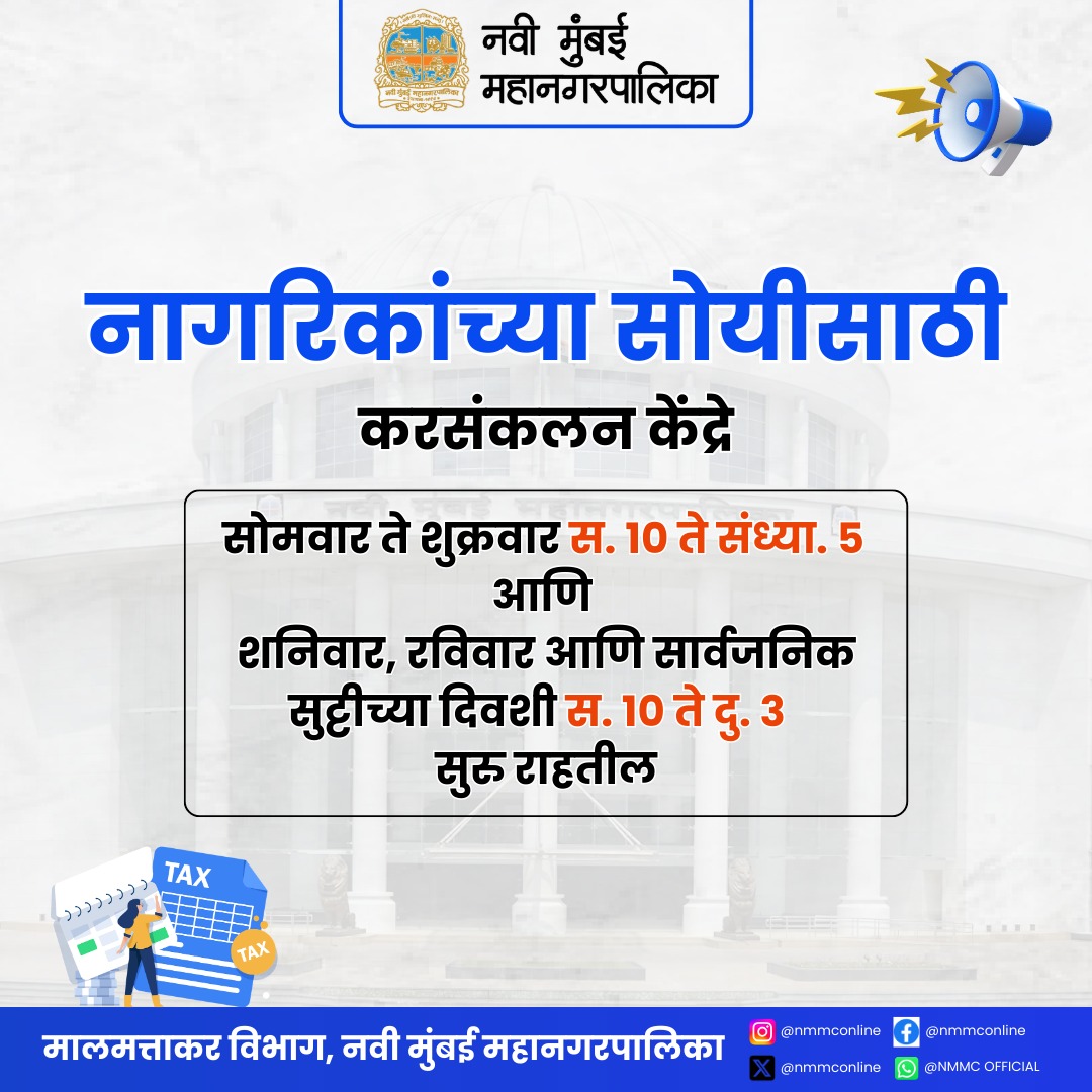 त्याचबरोबर नागरिकांच्या सोयीसाठी ऑनलाईन पद्धतीनेही मालमत्ता कर भरण्याची व्यवस्था उपलब्ध आहे. त्यामुळे नागरिकांनी महापालिकेच्या अधिकृत संकेतस्थळाला (www.nmmc.gov.in) भेट देऊन, Whatsapp Chatbot – 8291920504 द्वारे किंवा कर संकलन केंद्रात प्रत्यक्ष जाऊन आपला मालमत्ता कर भरावा असे आवाहन करण्यात येत आहे.