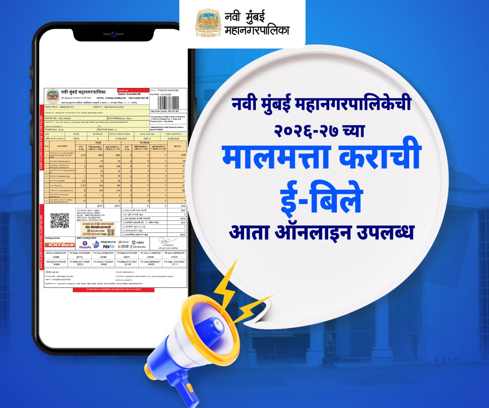 नवी मुंबई महानगरपालिकेच्या मालमत्ता कर विभागामार्फत आर्थिक वर्ष २०२६-२७ साठी मालमत्ता कराची ई-बिले तयार करण्यात आली असून, नागरिकांना आपले मालमत्ता कराचे बिल व्हाट्सअॅप चॅटबॉट तसेच महापालिकेच्या www.nmmc.gov.in या अधिकृत संकेतस्थळाच्या माध्यमातून केवळ काही मिनिटांत पाहता येईल, डाऊनलोड करता येईल आणि त्यासोबतच बिलाचा भरणा करता येणार आहे.